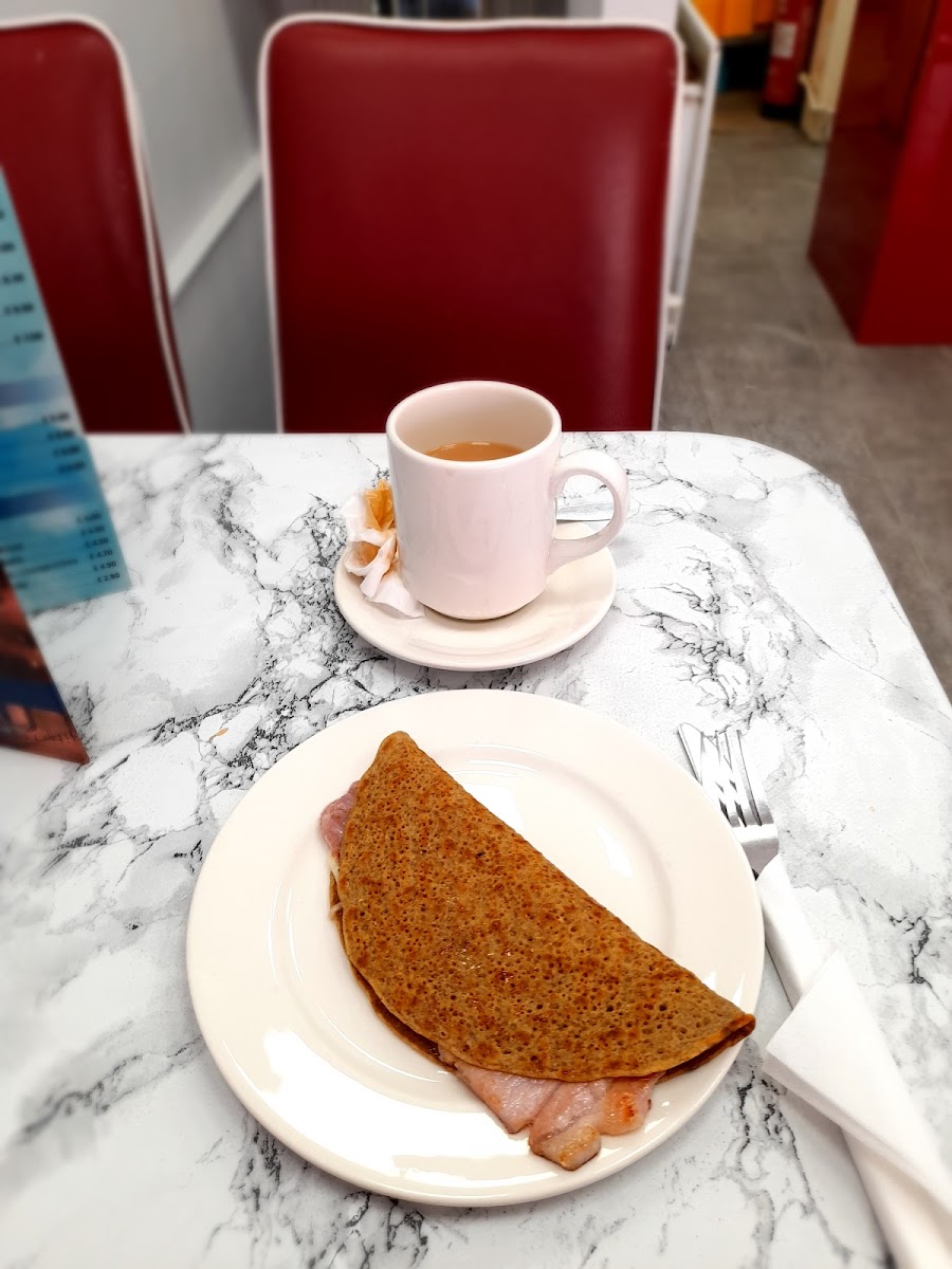 A good lunch to be had here, a nice and clean environment. Friendly staff, and pleasant background music playing. As to the meal, I had a sausage & cheese oatcake, followed by a bacon & cheese oatcake; washed down with a mug of tea. The oatcake (not to be confused with a flapjack), was nicely cooked; as it was still soft. Both the bacon and sausage fillings were generous; a quick note regarding the cheese, it was very tasty, but chewy. The tea came with the bag still in, and the waitress didn't mind that I asked for some more milk.